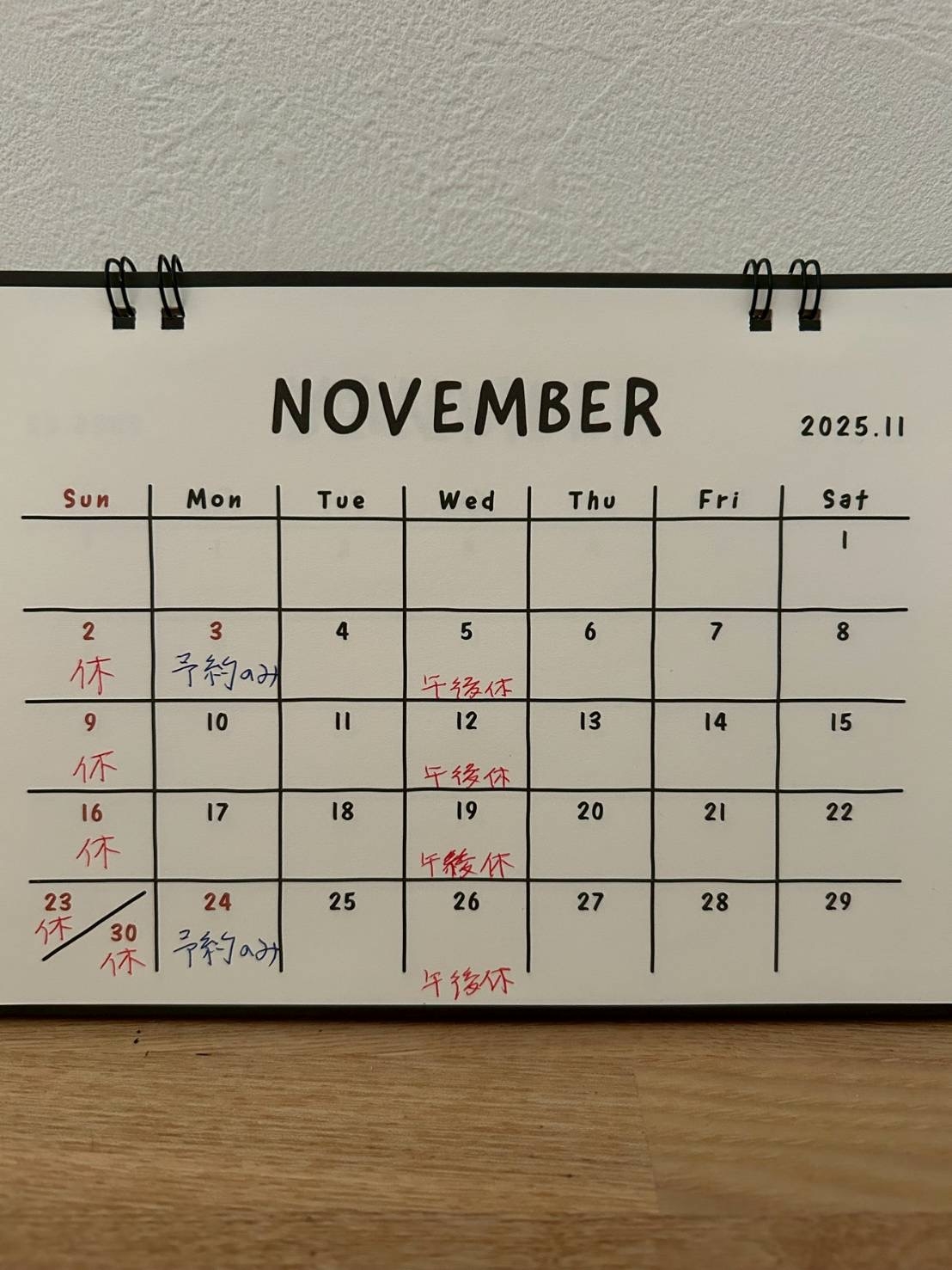 - (明日の受付についてのお知らせ) 11月24日は祝日ですがご予約の方のみご案内させていただきます